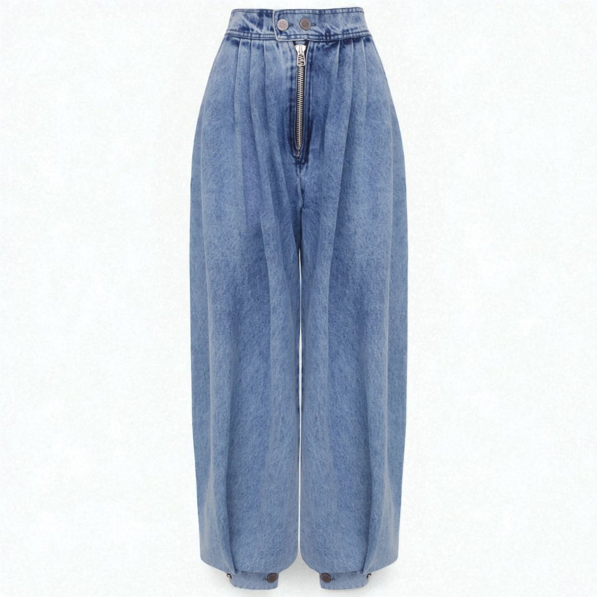 With a dramatic high-waist and a voluminous fit through the leg, these trousers create a striking, billowy silhouette. The exposed front zipper and tapered ankle complete the look, making them a true statement piece for your wardrobe.
