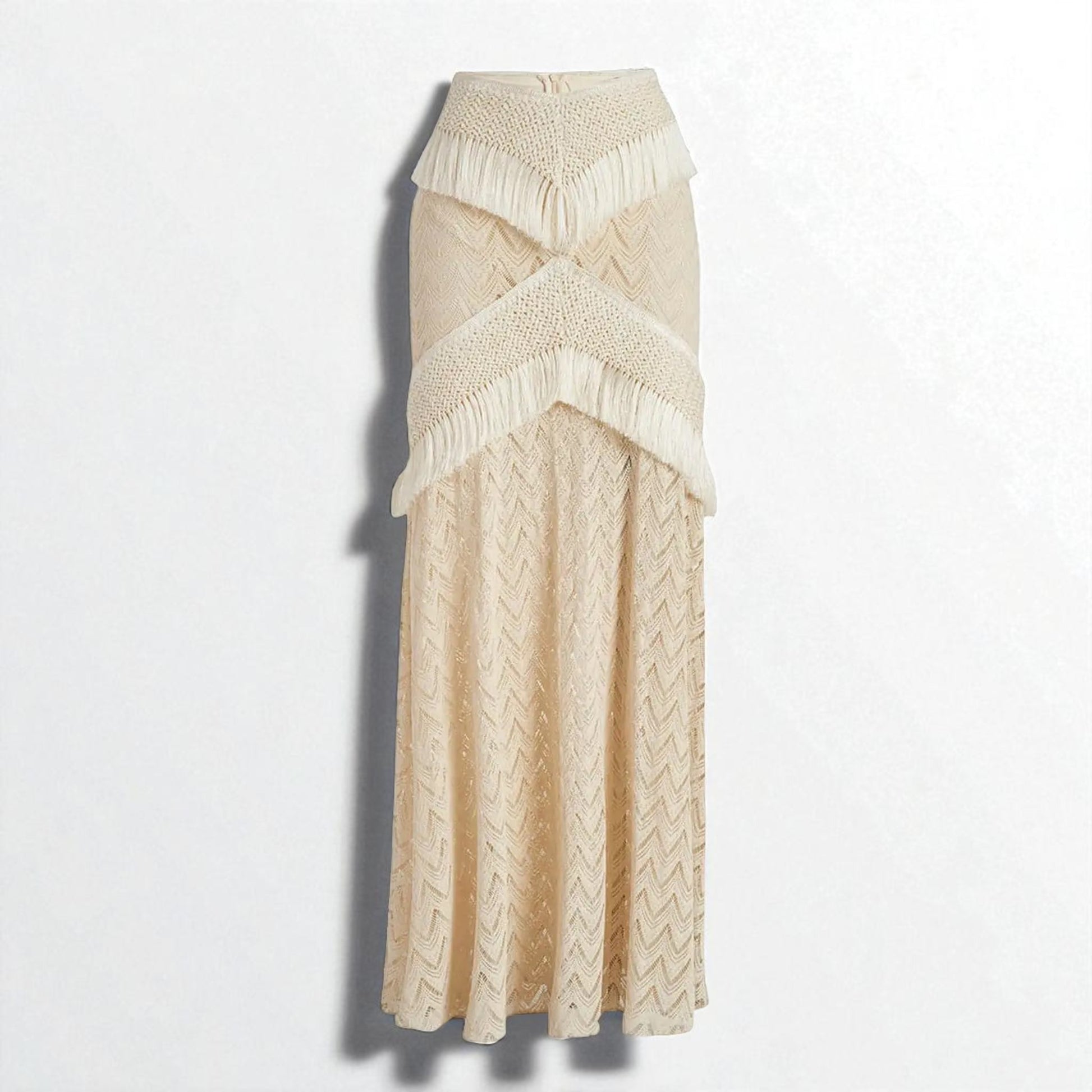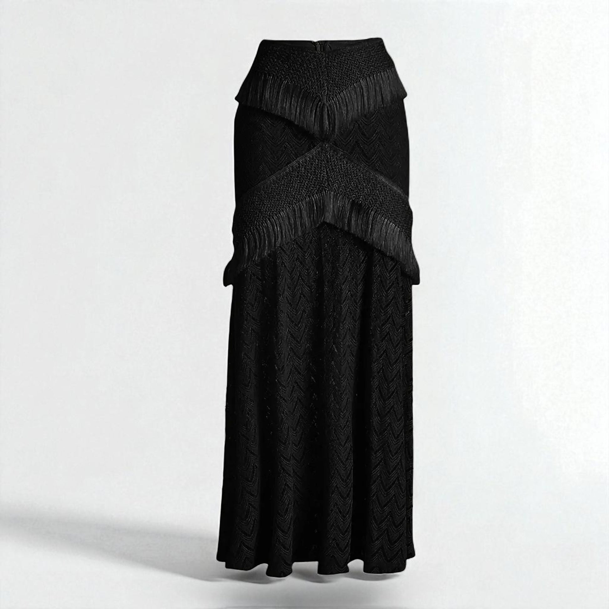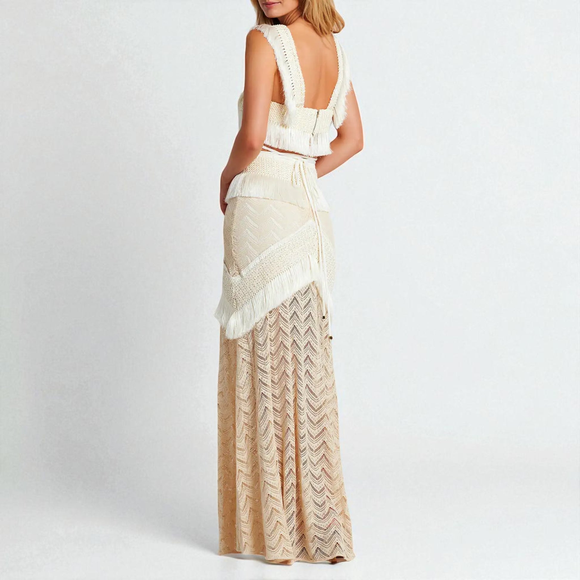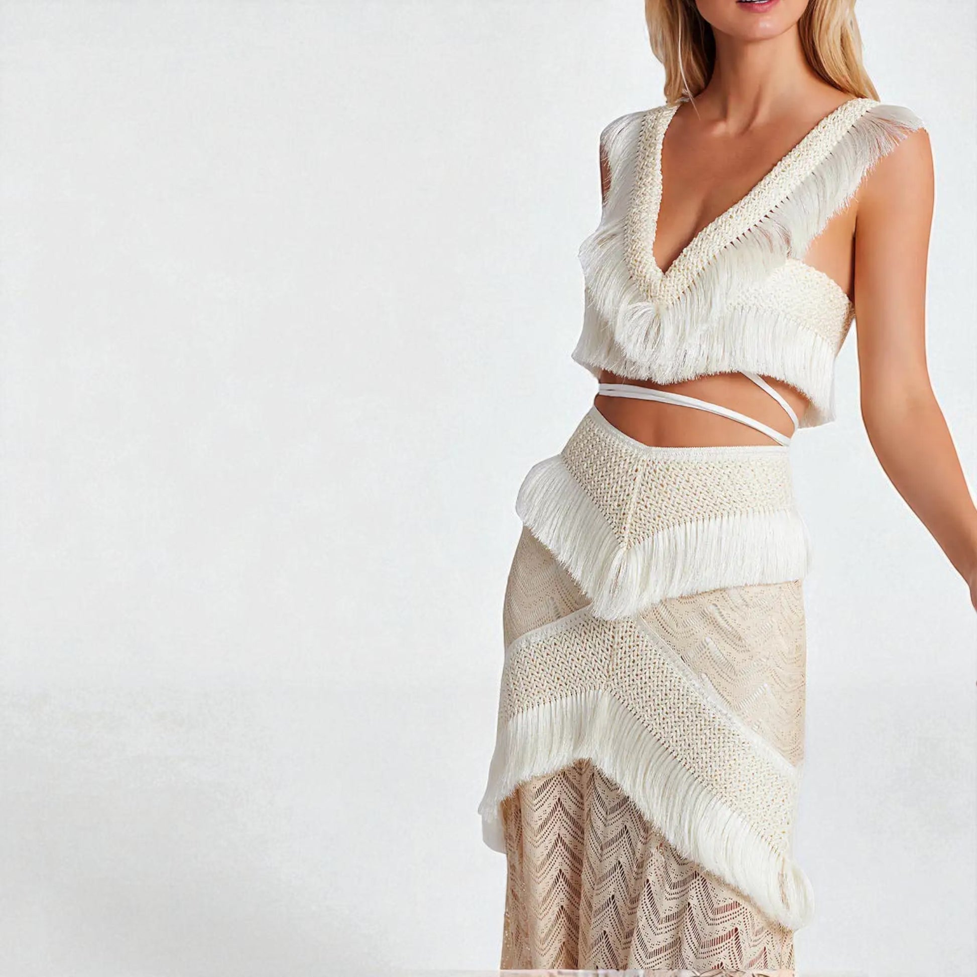 Crafted from a soft blend of Spandex and Polyester, this set features a beautifully woven design with fringe details and a universally flattering cut. Both the cropped top and skirt offer a comfortable fit, securing with discreet back zippers. Completing the look, integrated matching bottoms ensure a confident wear.