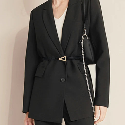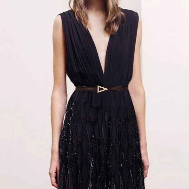 Crafted from premium leather with precise stitching, its distinctive gold triangle buckle adds a subtle touch of modern edge. The Delta Cinch Belt offers a minimalist yet impactful statement piece from Grayson & Grace.