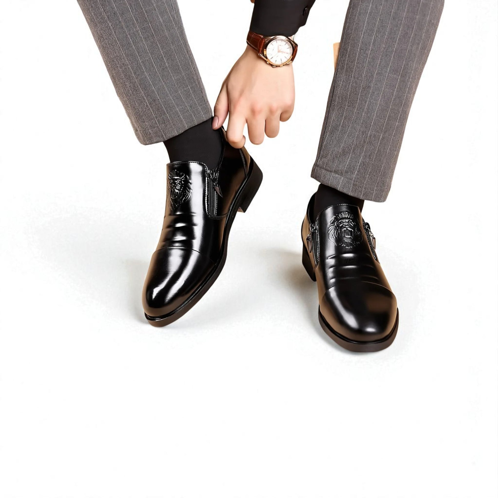 Designed for superior comfort and ease, the León Brogue makes a bold statement with its distinct embossed lion head and practical side zipper. Crafted from flexible leather with a durable rubber sole, these breathable shoes blend class with modern convenience.