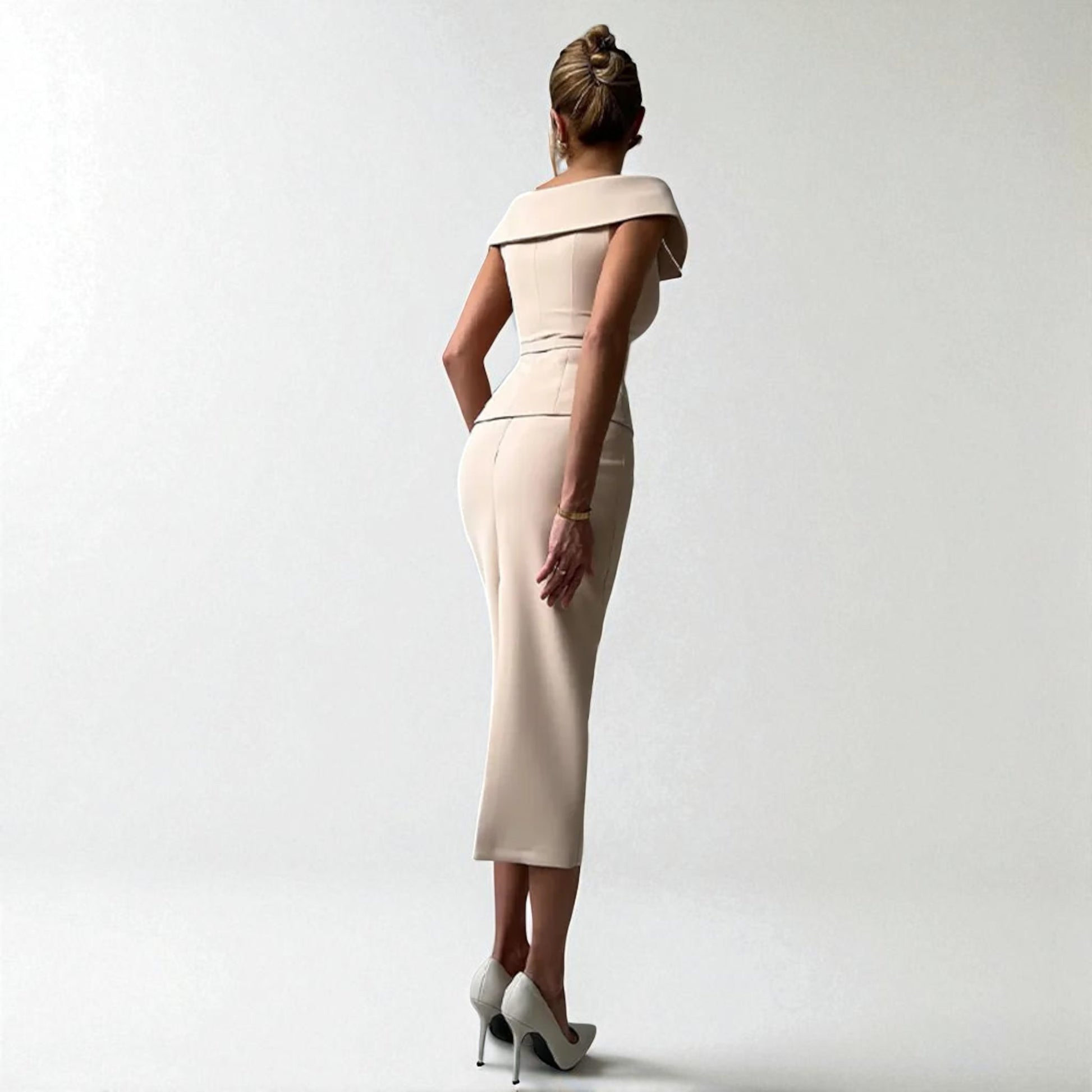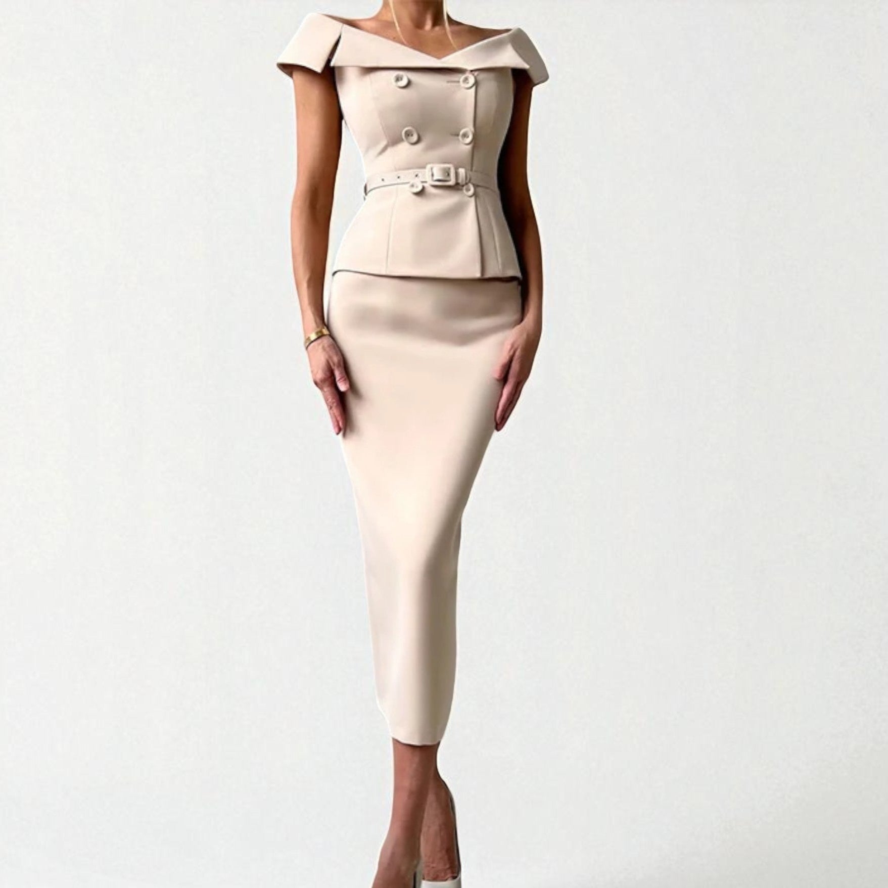 - Off-shoulder top with a classic pencil skirt.