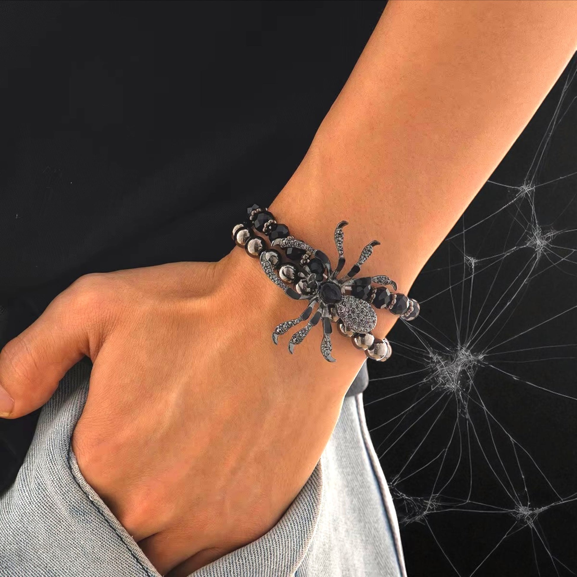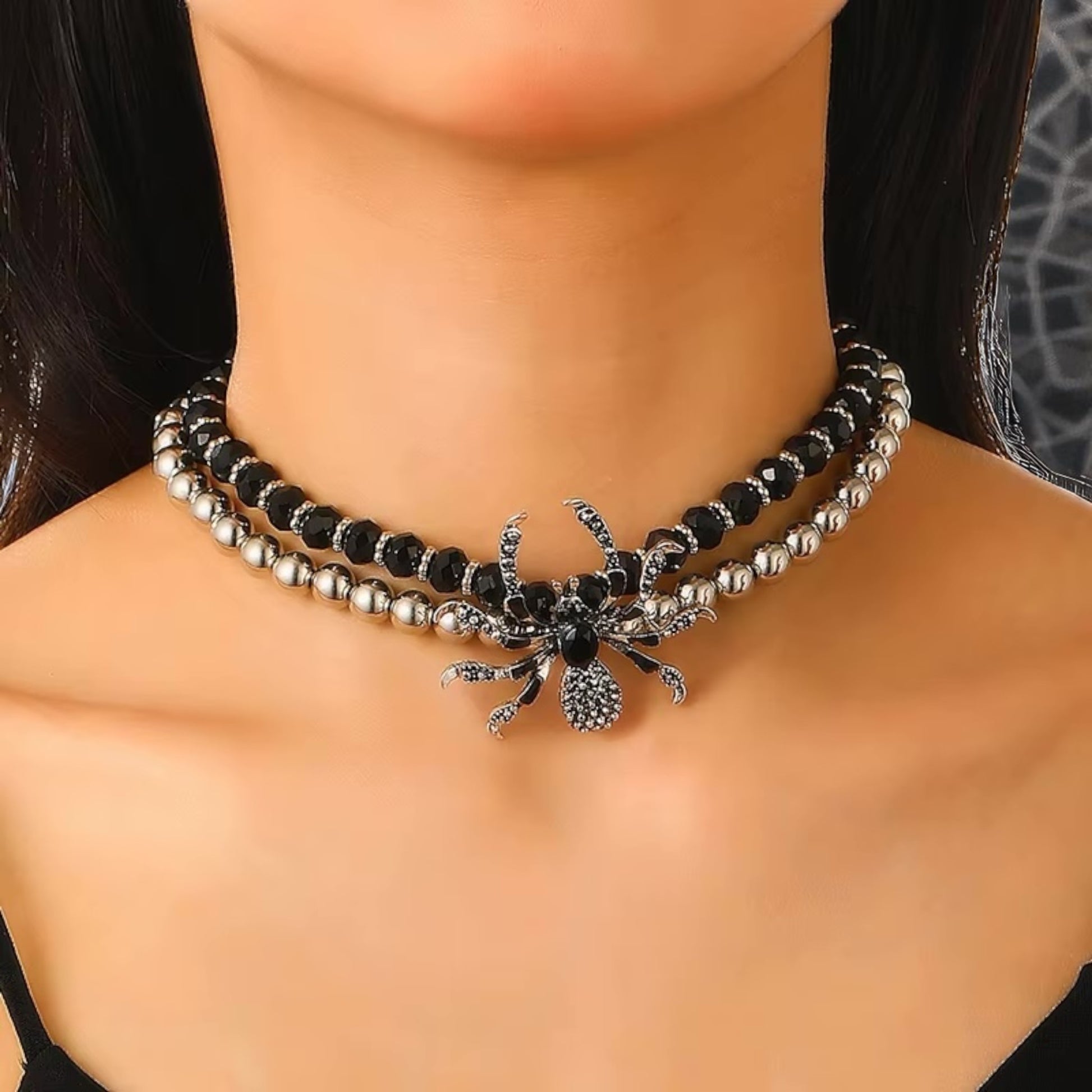 Weave a web of intrigue this season with the Arachnid Set, a three-piece collection designed for bold, spooky style. This set features a layered choker, a striking bracelet, and a matching ring, each adorned with a crawling spider pendant.