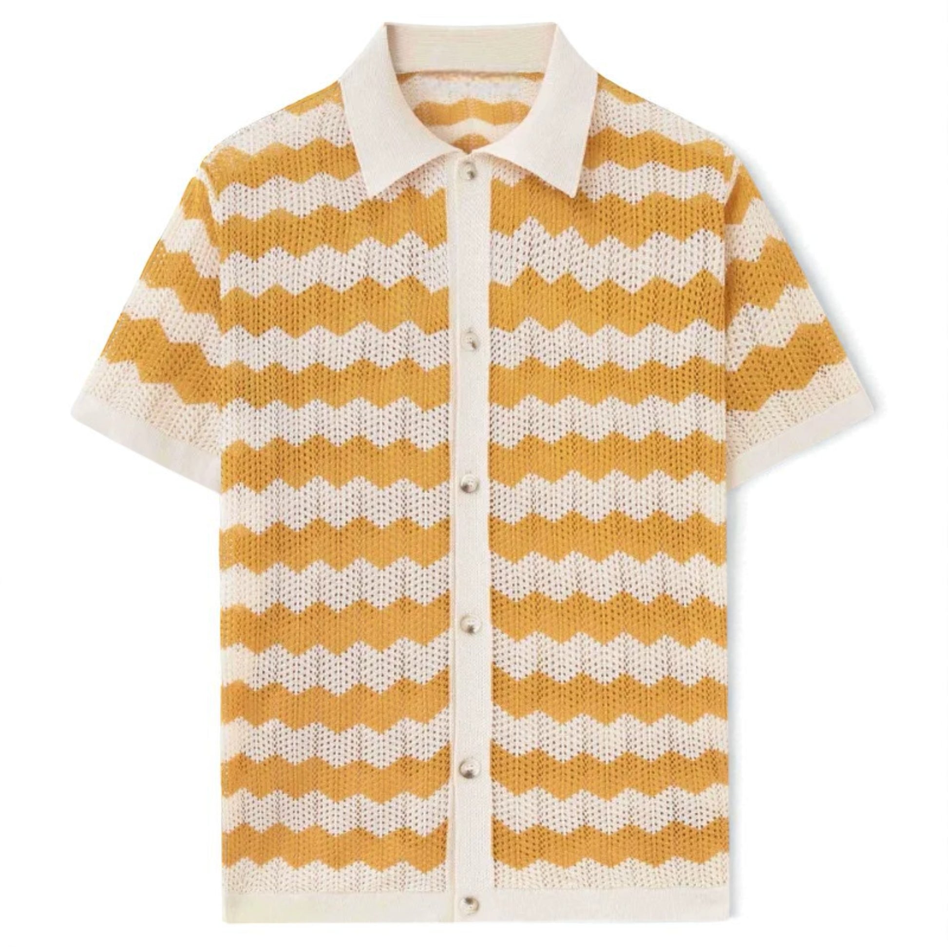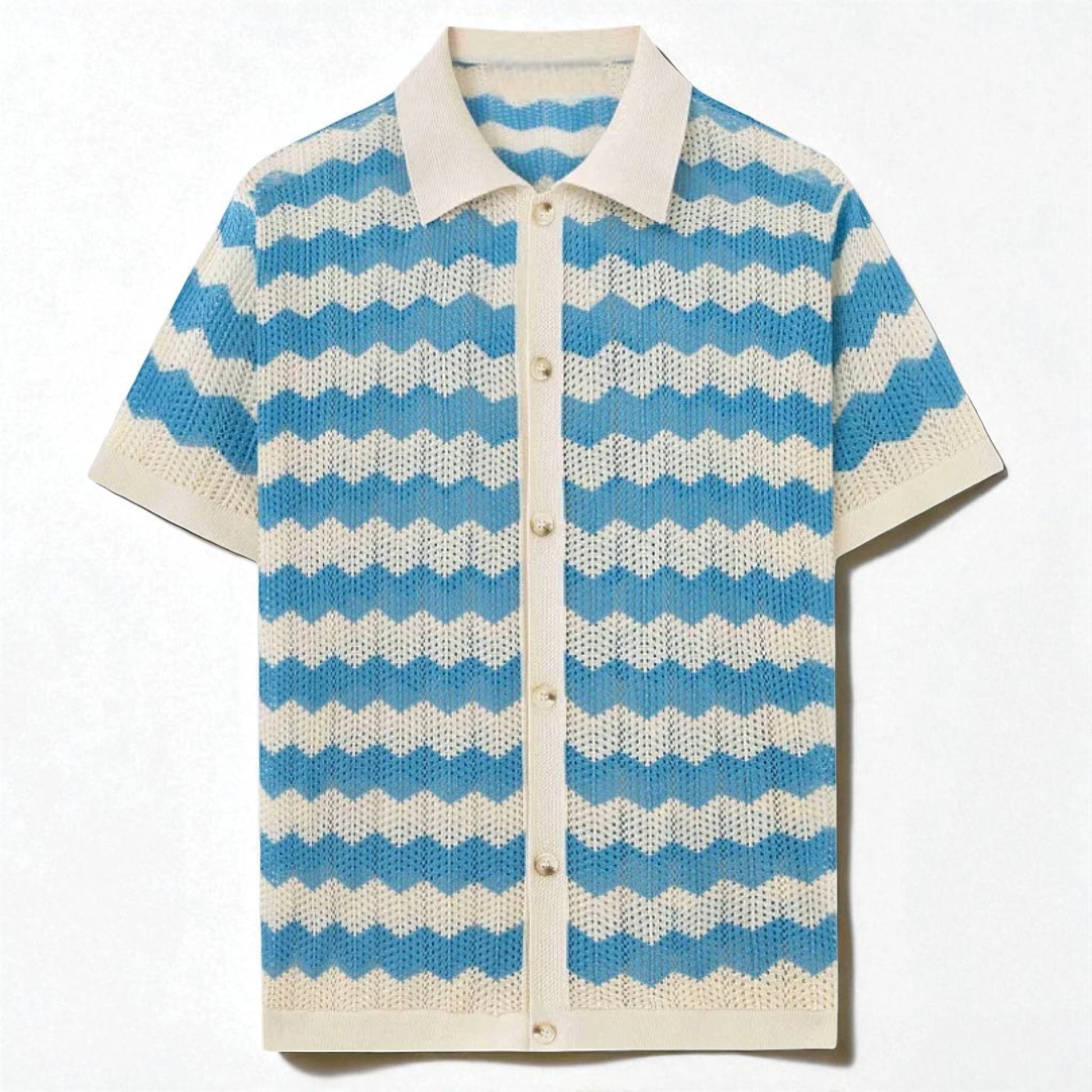 Your go-to for staying cool and stylish, expertly crafted from a breathable cotton blend knit with a distinctive wavy pattern. This collared button-down offers relaxed comfort perfect for any sunny day.